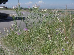 Spotted knapweed and Diffuse knapweed – These invasive weeds are very similar in appearance, and can grow as an annual, biennial or perennial. Flowers can be white or purple. As a young plant, it is easy to identify each by the “rosette”, low growing pattern and leaf shape. In the fall, this plant dries, breaks off, and becomes a tumbleweed, scattering seeds far away.