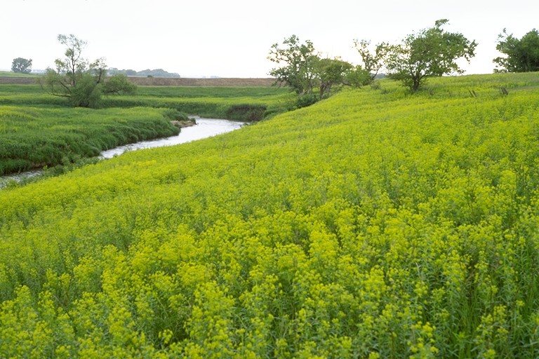 Leafy spurge is a non-native noxious and invasive weed that is probably the biggest threat to our neighborhood. Its roots can extend 30 feet deep, and extend 15 feet out from a plant. The white, sticky sap from this weed contains a substance called alkaloid euphorbon, which is toxic to humans and animals and is a known co-carcinogen. The sap seriously irritates the skin of people and animals and can cause human blindness upon eye contact. The root sap gives off a substance that inhibits the growth of grasses and surrounding plants.